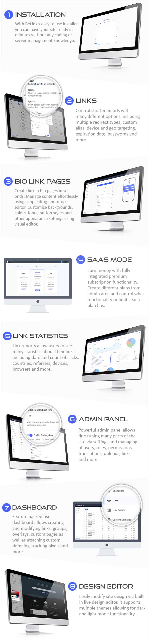 BeLink 是目前可用的最高质量和最先进的 url 缩短器应用程序。 它可用于在几分钟内轻松创建您自己的公共或私人 url 缩短器网站,而无需任何编码知识。 它具有简洁、更时尚的设计、高质量的代码和无与伦比的功能集。 阅读有关以下功能的更多信息,并尝试演示网站,了解为什么BeLink很容易成为最佳选择。